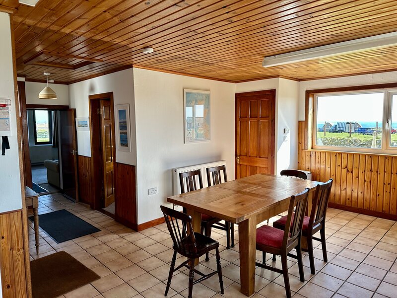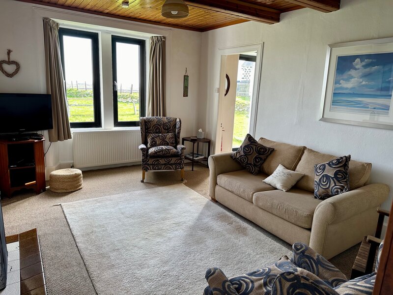 Ruaig is approximately 5 miles from Scarinish pier. Turn right at the end of the pier road following the sign for Caoles. Then, after less than half a mile you will take another right hand turn for Caoles. After travelling the length of Gott Bay you will pass Ruaig farm on your right. Shortly after that you will see a right hand turn, turn right and follow this road for a further half mile to almost the end of the road. Turn in left just immediately before the pink house and Cnoc Ruaig is set back on the left.