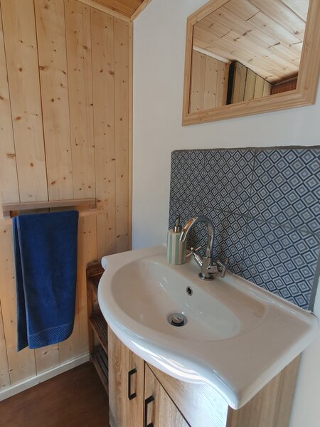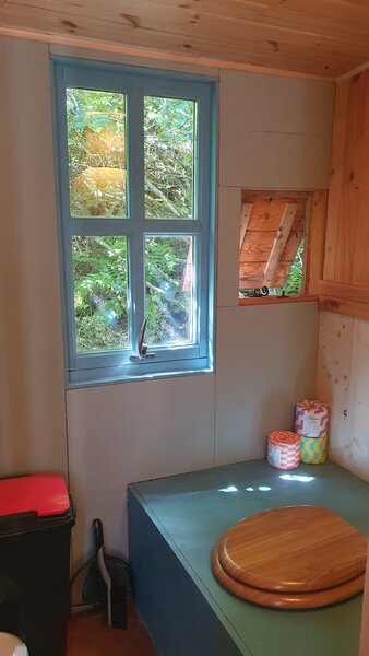 Separate shower. Separate indoor composting toilet. Separate utility room/back kitchen/porch with washing machine, fridge and storage.